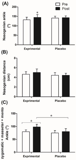 Regarding facial contour by means of photogrammetry (Figure 4), significant differences (p < 0.05) were found in favor of the experimental group compared to the placebo group. The angle of the nasogenian fold increased by 10° for the experimental group (d = 1.0; p = 0.043), while the placebo group increased by only 2° (pre = 141° vs. post = 143°; without intragroup difference: Figure 4A). A significant increase (p < 0.01) and superiority to the placebo (GE = 19° vs. GP = 6°) was found in favor of the experimental group (large size of effect in (d = 2.71) to measure the contour of the zygomatic–masseter–mentalis angle (ZMM) obtained by the union of zygomatic, masseter, and mentalis points (Figure 4C). No difference between the groups (p = 0.678), nor the intervention (p = 0.249) and interaction (p = 0.424) effects were found to measure the distance from the nasogenian (Figure 4B).