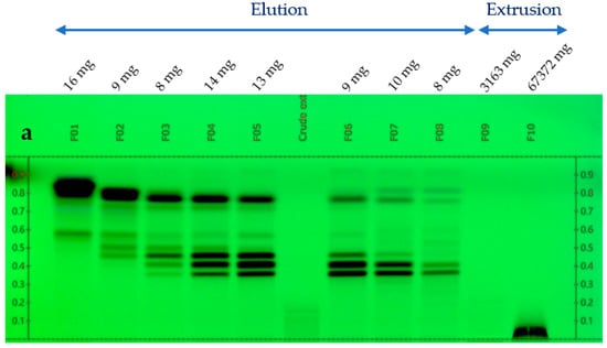 The glycerol/water extract (1/1, w/w) was preliminarily evaporated under vacuum with a rotary evaporator at 50 °C, 5 mbar during 5 h to eliminate water. A concentrated extract of 76 g was obtained from 150 g of the starting sample. This concentrated extract was fractionated by Centrifugal Partition Chromatography (CPC) over 2 strictly identical experiments, each starting from 33 g (total mass used for CPC = 66 g). CPC was performed with an FCPE300® (Rousselet Robatel Kromaton). A column with a 303 mL capacity was made of 7 partition disks engraved with 231 twin cells of ≈1 mL each. The liquid phases were pumped with a Knauer preparative 1800 V7115 pump. The biphasic solvent system was ethyl acetate/acetonitrile/water (3/3/4, v/v) used in the ascending mode, and the flow rate was set at 20 mL/min. After filling the column with the lower phase of the biphasic solvent system, and equilibration at 1300 rpm and 20 mL/min, the glycerol concentrated extract was diluted in 10 mL of water + 6 mL of acetonitrile and injected. The mobile phase (upper phase) was pumped for 64 min for the elution step. Then, all the compounds retained inside the column were recovered by extrusion for 10 min. Fractions of 20 mL were collected over the whole experiment (elution and extrusion) and combined according to their thin-layer chromatography profiles (TLC). TLC was performed with a CAMAG® automatic sampler ATS4, a CAMAG® automatic developing chamber ADC2, and a CAMAG® TLC visualizer 2. Fractions were deposited on pre-coated silica gel 60 F254 Merck plates with the migration solvent system ethyl acetate/acetic acid/formic acid (10/1/1, v/v), visualized under UV light 254 nm and 366 nm, and revealed by spraying the dried plates with 50% H2SO4 and vanillin followed by heating. As a result, 10 identical final fractions accumulated from the 2 CPC experiments were obtained (Figure 1). The mass distribution of all the fractions is also indicated in Figure 1.