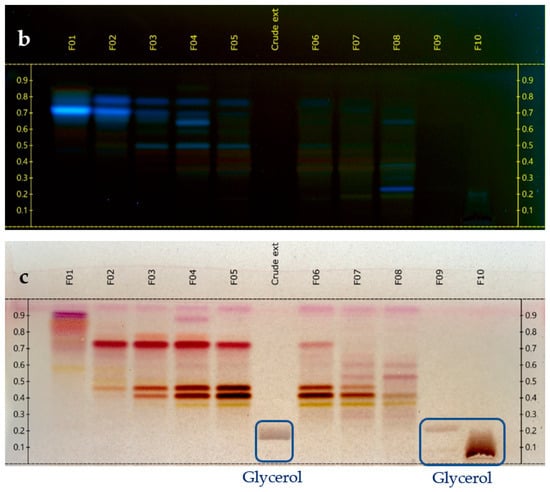TLC profile of the 10 CPC fractions. (a) 254 nm; (b) 366 nm; and (c) visible after vanillin/H2SO4 reagent spraying and heating.