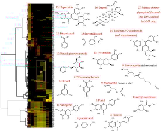 After 1D and 2D NMR analyses, an automatic peak picking was performed on 13C NMR spectra of fractions F01–F08, and the collected peaks were aligned across the fraction series using a bucketing strategy. The resulting table was made of eight columns corresponding to the CPC fractions, and 205 rows corresponding to the chemical shift buckets, for which at least 1 13C peak was detected in at least 1 fraction. The variables inside the table corresponded to the absolute intensities of 13C NMR peaks. Hierarchical Clustering Analysis (HCA) was applied on the rows to organize 13C NMR chemical shifts as clusters for the peaks having an identical evolution across the fraction series, probably meaning that these peaks belong to the same chemical structure. The HCA heat map is presented in Figure 3. Seventeen chemical shift clusters were aggregated on the heat map. These chemical shift clusters were tentatively assigned to chemical structures using a database that contains the predicted 13C NMR chemical shifts of small natural metabolites. The chemical structures proposed by the database were then rigorously confirmed for all atom positions by 2D NMR data interpretation, leading to the unambiguous identification of a total of fourteen metabolites of the Alpine rose extract, as well as two compounds probably resulting from solvent artefacts (monoacetin and monocaprylin). Flavonoids were, by far, the main compounds detected in fractions F01–F08, with taxifolin 3-O-arabinoside as the leading representative of this chemical class, identified in fractions F03 to F07 under two stereoisomeric forms. Hyperoside and (+)-catechin were also significant constituents of the extract, followed by a diversity of flavanones, including naringenin, porriol, and farrerol. Orcinol, methyl-orcellinate, and phloroacetophenone were detected in the least fraction F01, followed by benzoic acid and isovanillic acid in fraction F02. One pentacyclic triterpene, namely, lupeol, was also identified in fraction F04. Glycosylated flavonoids, monomeric flavanols (catechin), and phloroacetophenone derivatives have already been reported in the leaves of Rhododendron ferrugineum [8,9,20]. The 13C and 1H NMR chemical shifts observed for all the fourteen identified metabolites and validated with the help of HSQC, HMBC, and COSY spectra of the CPC fractions are summarized in a Supplementary Data file.