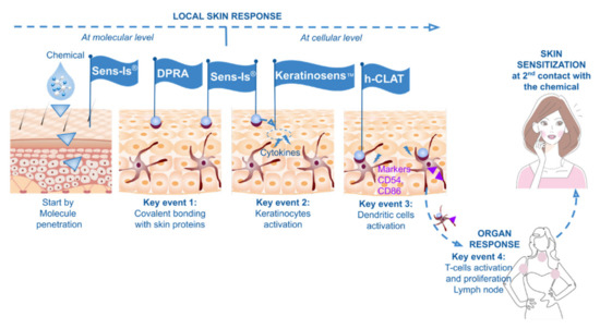 The prevalence of allergic contact dermatitis (ACD) is increasing continuously in Europe and worldwide. A review of 28 studies published between 2007 and 2017 covering 20,107 patch test individuals in the general population found a pooled prevalence of around 20% in Europe, with 16.5% in children and adolescents, 27.9% in women and 13% in men [1]. Dermatologists highlighted that allergen trends have clearly evolved over a defined period of time, sometimes in a short period with the emergence of new allergens [2]. The frequency of occurrence of this skin pathology and the evolving context justify the need to assess skin sensitization potential for any ingredient intended for topical applications. Since the ban on animal testing in Europe, and its extension to many parts of the world, a battery of in vitro tests covering the key steps of the Adverse Outcome Pathway (AOP) for skin sensitization is recommended (OECD Series on Testing and Assessment No. 168 [3]). The AOP concept describes a sequential chain of causally linked Key Events at different levels of biological organization that lead to an adverse health effect. In 2012, a document describing the skin sensitization AOP was published (OECD Series on Testing and Assessment No. 168). Four events are recognized as key, following the prerequisite of skin penetration: (1) molecular interaction with skin proteins; (2) response of activated keratinocytes with inflammatory and gene expression associated with cell signaling pathways (e.g., Antioxidant/electrophile Response Element-dependent pathways—ARE); (3) activation of dendritic cells associated with specific cell surface markers expression, chemokines and cytokines; and (4) T-cell activation and proliferation (Figure 1).