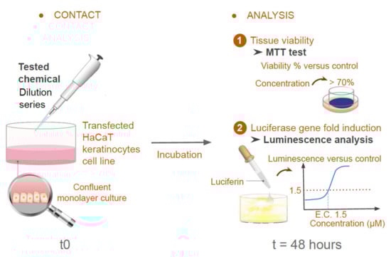 KeratinoSens (Givaudan SA, Switzerland) (Figure 2) is an in vitro assay focusing on the activation of the Keap1-Nrf2-ARE (Kelch-like ECH-associated protein 1—Nuclear factor erythroid—Related Factor 2-Antioxidant Response Element) pathway in transfected keratinocytes containing a luciferase gene, exposed to a test chemical. A concentration series of test chemicals based on the maximum achievable dilution, prepared in either aqueous media or Dimethyl Sulfoxide (DMSO), were applied to the cells for 48 h. Viability was then measured using the MTT test ((3-(four, 5-dimethylthiazol-2-yl)-2, 5-diphenyl tetrazolium bromide: MTT; 27 μL of a solution at 5 mg/mL in Dulbecco’s phosphate-buffered saline was added to each well). Keratinocyte activation was assessed by luciferase measurement after addition of luciferin in the wells (50 μL in each well). Negative control was defined as the culture medium with or without the solvent used as a vehicle for test item preparation. The positive control was the Cinnamic Aldehyde (CAS No. 14371-10-9) tested at concentrations ranging from 4 to 64 μM. A test chemical was considered positive when the luciferase expression is higher by a factor of at least 1.5 compared to control wells with a dose-effect relationship. Furthermore, the cytotoxicity level must be below 30%.
