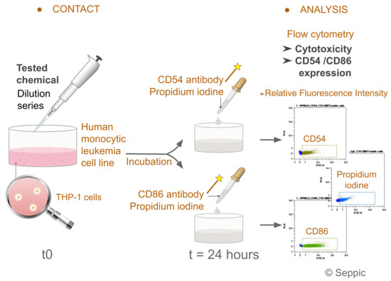 h-CLAT (Figure 3) is an in vitro assay quantifying changes in the expression of the CD86 and CD54 (Cluster of Differentiation 86 and 54) membrane phenotypic protein markers in a human monocytic leukemia cell line (THP-1 cells) exposed to a test chemical. Based on the CV75 value (i.e., concentration inducing 25% cytotoxicity), THP-1 cells were incubated with a series of eight concentrations (in either aqueous media or DMSO) for a period of 24 h. Cells were then labeled with fluorochrome-coupled anti-CD86 and anti-CD54 antibodies (50 μL antibody solution; 6µL anti-CD86 in 44 µL staining buffer and 3 µL of anti-CD54 in 47 µL of staining buffer) and analyzed by flow cytometry in order to determine the Relative Fluorescence Intensity (RFI). Propidium iodine (50 μg/mL diluted in PBS) assessed cell viability. Negative control was defined as Lactic acid (CAS No.: 50-21-5) tested at 1000 µg/mL. Positive control was 1-chloro-2,4-dinitrobenzen (DNCB; CAS No.: 97-00-7) tested at 4.0 µg/mL. A test chemical was considered positive as long as the expression of at least one of the two cell surface markers was reproducible and notably increased (i.e., CD86 RFI ≥ 150% and/or CD54 RFI ≥ 200% in at least one tested concentration). These results should be obtained in two independent runs and in the absence of strong cytotoxicity (i.e., viability ≥ 50%).
