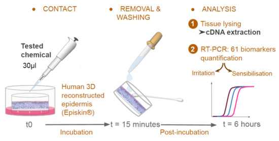 Sens-Is (Grasse, France) (Figure 4) is an in vitro assay analyzing the expression of a panel of genes relevant to the biological processes [8] in a reconstructed human epidermis model (Episkin® (Lyon, France)) exposed to a test chemical. Two sets of genes involved in skin sensitization mechanisms are followed; (1) called ‘REDOX’ focuses on the Keap1-Nrf2-ARE dependent pathway, (2) named ‘SENS-IS’ is linked to signals leading to the activation of dendritic cells. Chemicals binding to cysteine activate the ‘REDOX’ group of genes, whereas chemicals binding only to lysine activate genes within the ‘SENS-IS’ group. The Sens-Is assay discriminates between irritants and sensitizers using a third group of dedicated genes. The experimental protocol follows the Immunosearch Standard Operating Protocol (SOP). Briefly, human 3D reconstructed epidermis were exposed for 15 min to the test chemical (30 µL), pure when possible or dissolved in Phosphate Buffered Saline (PBS), olive oil, DMSO or Dipropylene Glycol. After washing and 6 h post-incubation, tissues were prepared for complementary Deoxyribonucleic Acid (cDNA) quantification by Reverse Transcriptase—Polymerase Chain Reaction (RT-PCR). For each analysis, three negative controls (PBS, olive oil and DMSO), a positive irritation control Sodium Lauryl Sulfate (CAS No. 151-21-3) at 5%, and a positive sensitization control 2,4,6-trinitrobenzene sulfonic acid (TNBS; CAS No. 2508-19-2) at 1%, were performed. A test item was considered a sensitizer when at least seven genes in either group of genes are overexpressed (at least 1.25-fold control value).