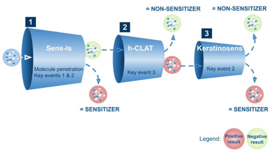 A sequential strategy was defined (Figure 5): Sens-Is was the entry test, followed by h-CLAT and KeratinoSens. In a conservative approach, a Sens-Is positive result was considered sufficient to classify the tested ingredient as a skin sensitizer and implied that no other test needs to be performed. In the case of a negative result, this figure must be confirmed by another in vitro test, the h-CLAT. Hence, two concordant results covering the first three KE of the AOP allowed us to conclude on the absence of sensitizing potential. In the case of non-concordant results, a third test (KeratinoSens) was necessary to conclude.