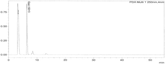 HPLC chromatogram of a hair dye sample showing the peak of PPD at 6.4 min.