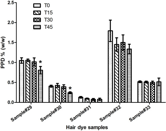 The contents of PPD in five dark color hair dyes ranging from brown to black were analyzed using the procedure described in the experimental section. For all formulations, the concentrations of PPD at T0 were lower than the regulatory limit of 2% (Table 7). After 45 min from starting the oxidation reaction, the content of PPD significantly reduced compared to the initial amount at T0 (Figure 2). A minimum of 60% of the initial amount of PPD remained unreacted in the color formulations after the color development. Particularly, 76.92% and 74.30% of PPD remained unconsumed in the mixtures of sample numbers 29 and 32, respectively.