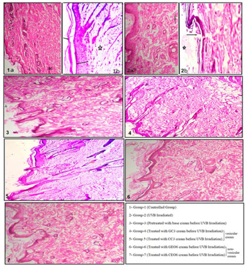 Histopathology of skin sections of all groups; (1(a,b)) Skin section of group 1 (Neither irradiated nor treated with test formulation) [in 1b ― line represents epidermis, arrow represents stratum corneum, asterisk represents healthy dermis]; (2(a,b)) Skin section of group 2 (UVB-irradiated); [― in 2b represents epidermis, arrow represents stratum corneum, asterisk represents healthy dermis]; (3) Skin section of Group 3 (pre-treated with Base cream + UVB-irradiated); (4) Skin section of group 4 (pretreated with GC3 formulation + UVB-irradiated); (5) Skin section of group 5 (pretreated with CC3 Formulation + UVB-irradiated); (6) Skin section of group 6 (pretreated with GEO6 Formulation + UVB-irradiated); (7) Skin section of group 7 (pretreated with GEO6 Formulation + UVB-irradiated).