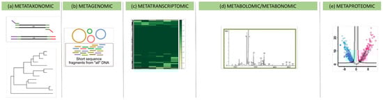 Schematic representation of omics techniques: (a) metataxonomic; (b) metagenomic; (c) metatranscriptomic; (d) metabolomic and metabonomic; (e) metaproteomic.