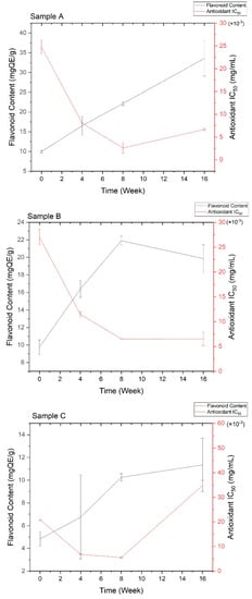 Samples A-B showed higher flavonoid content and were more active as an antioxidant than samples C-F. This result was observed due to the possibility of ascorbic acid degradation. In addition, the storage temperature of 40 + 0.5 °C exhibited lower flavonoid content and antioxidant activity since both flavonoids and ascorbic acid were sensitive to the high temperatures [42,45]. Higher temperature can cause the degradation of ascorbic acid to dehydroascorbic acid with 80% activity, which is readily hydrolyzed to 2,3-diketogulonic acid with less antioxidant activity [40]. At the same temperature, the addition of 10% ascorbic acid provided more flavonoid content and better antioxidant activity compared to the 15% addition in the first eight weeks. The lower concentration of ascorbic acid leads to less degradation of flavonoids, providing an excellent protective effect [40,45]. On the other hand, the higher concentration of ascorbic acid provides the maximum flavonoid content and antioxidant activity in a prolonged storage time up to 16 weeks due to the retention and formation of bioactive compounds [46]. Therefore, 10–15% ascorbic acid is the best pharmacological concentration [38,39].