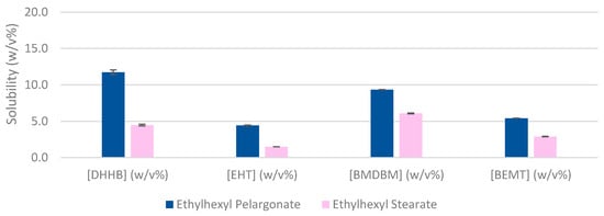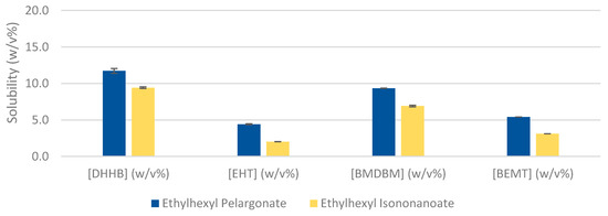 The differences between these results can only be attributable to the branching effect of the nine-carbon aliphatic chain since both emollients have the same Ethylhexyl scaffold. Even though we can appreciate a lower solubility of EHT and BEMT when compared to the other two UV filters, the general tendency is an overall higher solubility of Ethylhexyl Pelargonate (Figure 1). Having seen these results, we could deduce that ramification has a negative impact on the solubility.