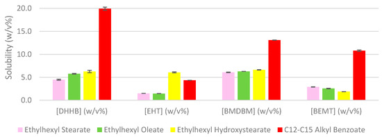 When comparing the repercussions of the chain length in the solubility, Ethylhexyl Pelargonate and Ethylhexyl Stearate present equivalent results as the previous analysis; where the less voluminous has better solubility, in this case the shorter the molecule the higher capacity of solubilizing UV filters (Figure 2).