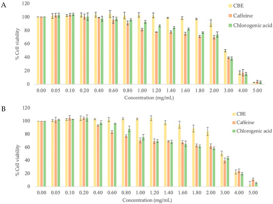 Cytotoxicity of various concentrations of CBE, caffeine, and chlorogenic acid on (A) HDF and (B) HFDP cells.