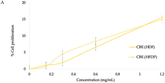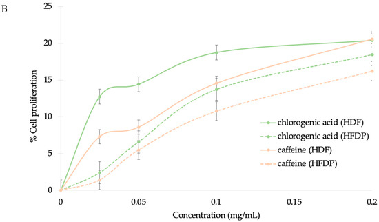 HDF and HFDP cell proliferation effect of various concentrations of CBE (A), caffeine, and chlorogenic acid (B).