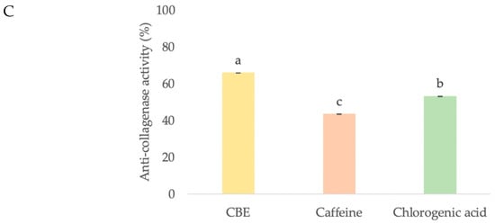 The superoxide dismutase (A), nitric oxide inhibition (B), and anti-collagenase (C) activities of CBE, caffeine, and chlorogenic acid on HDF. Data with different lower-case letters (a, b and c) indicate significant differences (p < 0.05) between samples.