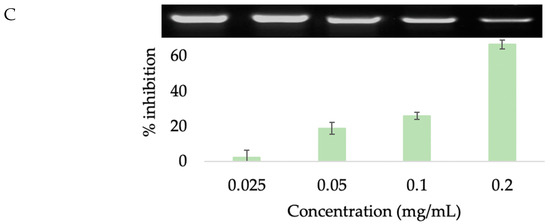 The clavation of interstitial collagens and alteration of the extracellular matrix are primarily responsible for the clinical manifestations of skin aging such as wrinkles, sagging, and laxity [43,44]. Hence, inhibition of collagenase was suggested as a key factor to slow down not only the loss of skin elasticity but also the progress of sagging [45]. Therefore, the evaluation of collagenase inhibition properties is the most often used assay to investigate the anti-aging effects of many natural products to be applied as cosmeceutical ingredients. To investigate the collagenase inhibition activity of CBE and reference compounds (caffeine and chlorogenic acid), bioassays were performed with a member of matrix metalloproteinases, MMP-1. Caffeine showed collagenase inhibition of 43.47%. The results corresponded to the report by Lee et al. [46], who established the inhibition of collagenase in a concentration-dependent manner of caffeine in an in silico experiment and an in vitro approach. Interestingly, CBE showed the highest significant inhibition of MMP-1, of 65.88%, followed by chlorogenic acid (53.19%) and caffeine (43.47%) (Figure 5C). This may be the result of the synergistic action of the chemically complex matrices of CBE. The results correspond with the study by McDaniel in which coffee berry extract showed down-regulated MMP-1 gene expression in biopsy skin samples that were taken and sectioned from participants who twice-daily applied CBE 1% cream and CBE 0.1% cleanser for 6 weeks [17].