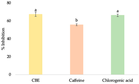 5α-reductase inhibition of CBE, caffeine, and chlorogenic acid at maximum nontoxic concentration. Data with different lower-case letters (a and b) indicate significant differences (p < 0.05) between samples.