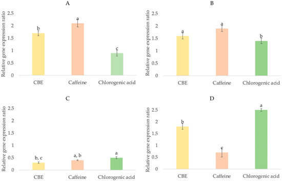 In order to investigate the SOD antioxidant-enhancing activity of CBE, a SOD determination kit that allows for a convenient assay by producing a water-soluble formazan dye upon reduction with a superoxide anion was used. The rate of reduction with O2 is linearly related to the xanthine oxidase activity, which is inhibited by SOD. Therefore, SOD activity can be quantified by measuring the decrease in the color development of WST-1 formazan. The treatment with CBE induced significantly higher SOD activity (74.53 ± 0.92%) than that of caffeine (12.56 ± 2.43%), but lower activity than that of chlorogenic acid (91.00 ± 1.11%) (Figure 5A). These outcomes are in agreement with those reported by Zofia, who noticed that green coffee extract (100 μg/mL) showed high activity of the superoxide dismutase enzyme, and its fermentation duration also had an effect on this ability, with 14-day fermented extract showing better results than extracts fermented for 7 and 28 days [14]. In addition, improvement of SOD and glutathione reductase (GR) activities by chlorogenic acid, caffeine and trigonelline were found in chronic coffee and caffeine ingestion mice [3].