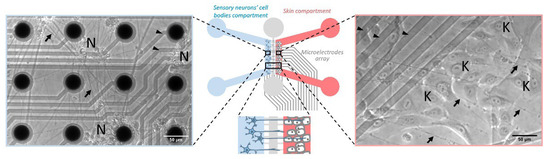 | [44] | Bi-compartmented culture with (1) rat DRG neurons; (2) rat primary epidermal keratinocytes | Systemic application of 100 nM capsaicin (TRPV1 agonist) in the epidermal/axonal compartment | Calcium imaging in the soma compartment showed a similar neuron activation by capsaicin either with or without keratinocytes. | ||