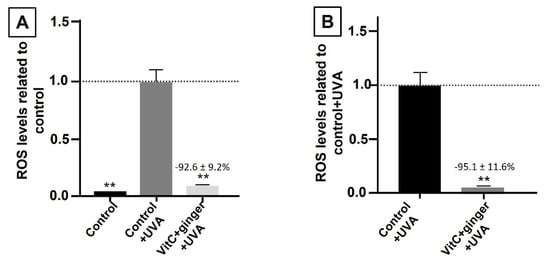 Reactive oxygen species (ROS) levels. (A) ROS levels related to untreated (and irradiated) control. (B) ROS levels related to the UVA irradiated control. ** statistically significant.