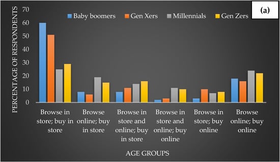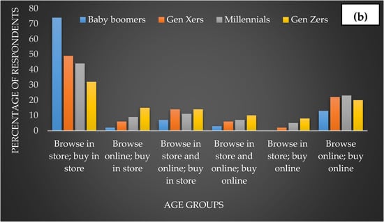 Assessment of in-store and online sales for cosmetic (a) and skin care (b) products according to different age groups (Baby boomers, Gen Xers, Millennials, Gen Zers); source, McKinsey new age of the consumer generational survey 2019 [22]. Baby boomers (1946–1964); Gen Xers/Z (1965–1980); Millennials (1981–1996); Gen Zers/Z (1997–2012).
