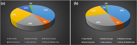 Global cosmetics market value by region, (a) 2016 data; from L’Oréal, 2016 (https://www.irinsider.org/economics-business-1/2018/9/29/loral-global-growth-strategy) (accessed on 18 September 2021); and (b) 2020 data; source from Statista (https://www.statista.com/statistics/971272/cosmetics-division-market-global/) (accessed on 27 May 2022).