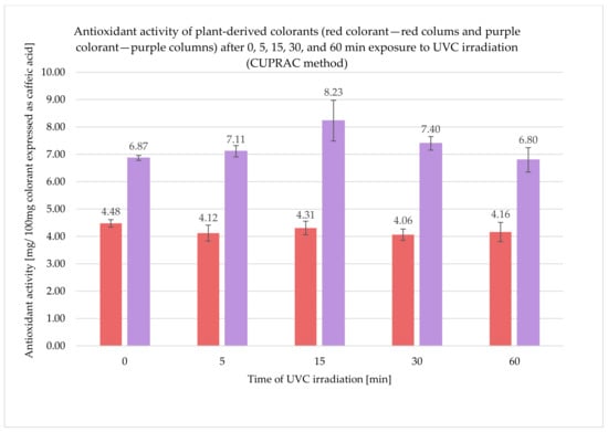 The antioxidant activity expressed as a caffeic acid equivalent was calculated in both tested colorants: red and purple after 0, 5, 15, 30, and 60 min of exposure to UVC irradiation. The results of the antioxidant activity from CUPRAC method obtained for red colorant after 0, 5, 15, 30, and 60 min exposure to UVC irradiation were as follows: 4.48 ± 0.14; 4.12 ± 0.29; 4.31 ± 0.25; 4.06 ± 0.21, and 4.16 ± 0.35 mg/100 mg colorant expressed as caffeic acid, respectively. On the other hand, the results obtained for purple colorant after 0, 5, 15, 30, and 60 min exposure to UVC irradiation were as follows: 6.87 ± 0.09; 7.11 ± 0.21; 8.23 ± 0.74; 7.40 ± 0.25; 6.80 ± 0.45 mg/100 mg colorant expressed as caffeic acid, respectively (Figure 1).