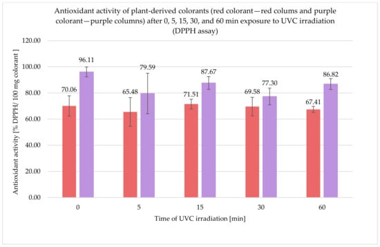 Antioxidant activity expressed as a percentage of the reduction of the DPPH radical for both tested colorants was calculated, and the results for the unexposed samples were as follows: for the red colorant 70.06 ± 7.74% DPPH/100 mg colorant and for the purple colorant 96.11 ± 3.80% DPPH/100 mg colorant (Figure 2). After 5, 15, 30, and 60 min exposure to UVC irradiation, the results for the red colorant were: 65.48 ± 10.97, 71.51 ± 3.71, 69.58 ± 7.07, and 67.41 ± 2.30% DPPH/100 mg colorant and for purple were 79.59 ± 15.46, 87.67 ± 4.91, 77.30 ± 6.37 and 86.82 ± 4.17% DPPH/100 mg colorant, respectively.