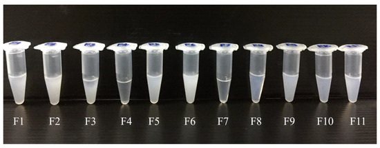 Eleven formulations of shampoo were established. The amounts of lavender oil, preservative, and ERW were fixed at 0.1%, 1%, and 50%, respectively. The concentration of surfactants (KD, KT, and ES) affected the foam boosting, sebum solubilizing, and cleansing functions of the shampoo and varied from 1% to 5% w/w according to the formulation obtained from the two-level factorial experimental design with the duplicate centroid (F10 and F11). The physical appearance and visual turbidity of the model shampoo formulations are shown in Figure 1.