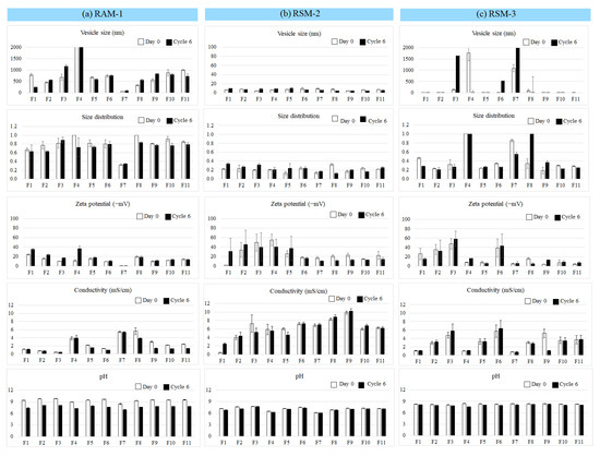 Several methods for critical micelle concentration (CMC) endpoint determination were introduced in a previous study [55]. Conductivity was used to identify the endpoint for the same type of surfactant as in micellization. The formation of micelles may be simulated by a conductivity measurement [39]. In this context, the CMC cannot be directly measured due to its mixed micelle behavior. However, the CMC was estimated by using a proper parameter [33]. Conductivity was an intrinsic factor that directly represented the physicochemical properties of the micellar formulation. This factor is also dependent on zeta potential and pH; thus, it was important to report the environmental conditions for accurate determination [39]. In this study, the conductivity of a mixed surfactant system was investigated. Conductivity was directly influenced by the surfactant (type and concentration), as shown in Figure 3. The difference in conductivity between Day 0 and Cycle 6 of the no-rinse shampoo obtained from RSM-1 fell in the green area less than that of RSM-2 and RSM-3 (Figure 4A–C). Conductivity could distinguish the stability of the combined-surfactant formulations [38]. The results revealed that the mixed surfactant of RSM-2 and RSM-3 resulted in the formulation of a proper no-rinse shampoo.