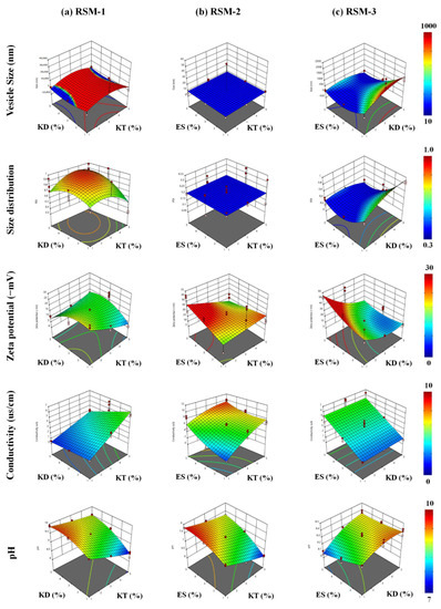 Figure 3c shows the response surfaces of the latent variables between KD and ES. The response surfaces suggested that an increase in KD results in a slight increase in size, size distribution, and pH and a slight decrease in zeta potential in the formulation. An increase in ES results in a significant decrease in size and size distribution, a slight decrease in pH, a significant increase in zeta potential, and a slight increase in conductivity in the formulation. The reliability of the size distribution, zeta potential, conductivity, and pH was adequate, as shown in Figure S2(c3).