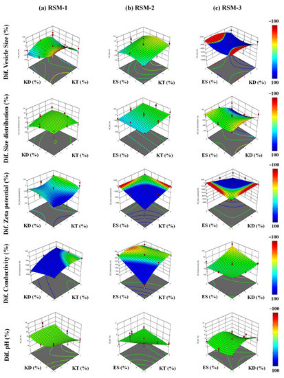 Response surface methodology (RSM) is a tool for estimating effective factors and is used to design models by predicting the interactions among causal factors (surfactant concentration), latent variables (vesicle size, size distribution, zeta potential, conductivity, and pH), and response variables (stability parameters and antimicrobial activity). Moreover, RSM can be used to identify the optimal conditions of variables for desirable responses [41]. The interactions between surfactants and the complex behavior of surfactant mixtures still need to be investigated on a case-by-case basis because the physicochemical characteristics of the micellar formulation affect their effectiveness [42] and stability [43,44]. Proper causal factors were chosen in the study, which confirmed their significance via the preliminary experiment [45].