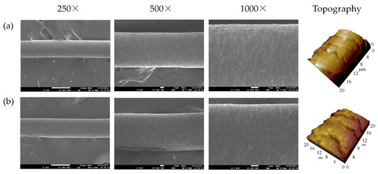 The cuticle peel and cuticle density can be identified through morphology monitoring using SEM and AFM. The comparison of untreated and treated hair revealed no specific peeling of the cuticles, and no cuticle density reduction was observed, as shown in Figure 6. These results revealed that the cuticle peeling and cuticle density of the treated hair fiber were not significantly different from those of the intact hair fiber.