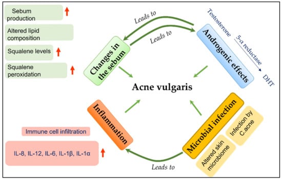 Acne vulgaris is a common skin condition involving the pilosebaceous follicles [,]. The pathological components of acne, as summarized in Figure 1, involve various cellular processes such as microbial infection, inflammation, and changes in sebum quality and quantity [].