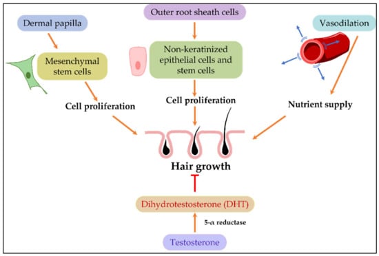 Key factors contributing for hair follicle growth. The proliferation of mesenchymal stem cells from dermal papilla and non-keratinized epithelial cells contributes to the growth of the hair follicles. Agents that can stimulate the growth of these cell types can be potential hair-growth promoters. The enzyme 5-alpha reductase converts testosterone into a more potent form, i.e., dihydrotestosterone (DHT), which has inhibitory effects on hair growth. Inhibiting this enzyme is one of the strategies for promoting hair growth. Finally, vasodilation facilitates nutrient supply to hair follicle cells and promotes hair growth.