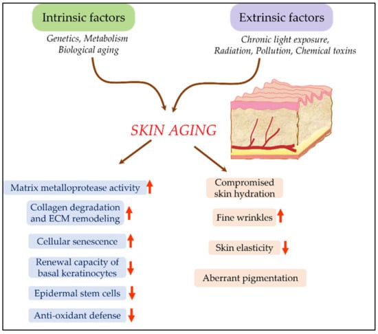 Cellular and morphological characteristics of skin aging. Skin aging can be due to either intrinsic or extrinsic factors. Along with age, there is an increase in the enzymes that degrade collagen and extracellular matrix. This results in reduced skin elasticity, leading to the appearance of external features of aging such as fine wrinkles, skin dehydration, and aberrant pigmentation. The up and down arrows in red indicate increase and decrease, respectively.