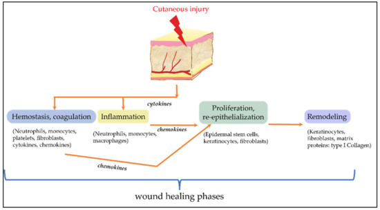 Cellular events involved in wound-healing. Wound-healing is a multi-phasic process involving cellular hemostasis, inflammation, proliferation, re-epithelialization, and remodeling. Cytokines and chemokines act as messengers to regulate these phases. Platelets, fibroblasts, immune cells, keratinocytes, and epidermal stem cells participate in this process. Remodeling through changes in ECM proteins and connective tissues comprises the final phase of wound-healing.