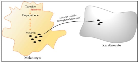 Schematic of melanin biosynthesis. Melanin biosynthesis takes place in melanocytes using tyrosine. Tyrosinase is a key enzyme for the synthesis of melanin. Once produced, melanin is transported to keratinocytes. Inhibition of tyrosinase, inhibition of melanogenesis, and melanin transfer are the main functions considered when screening cosmetic ingredients for their anti-hyperpigmentation activity.