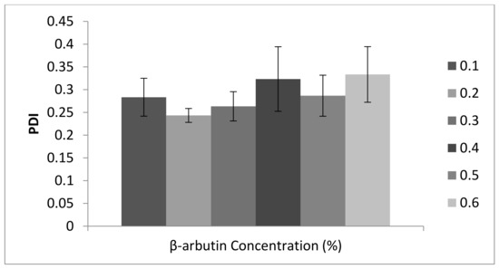 Entrapment efficiency is influenced by fabrication processes, preparation, methods, the physiochemical properties of β-arbutin [13,35,36,37], and numerous formulation variables [13]. In the present study, the use of β-arbutin concentrations of 0.5% and 0.6% caused a slight reduction in the drug-loading capacity of the nanoparticles. It appears both encapsulation and loading capacities reach an optimum at 0.4% β-arbutin concentration. Increasing the formulation ratio between β-arbutin and CS leads to an improvement in entrapment efficiency due to the formation of larger particles with reduced surface area, resulting in a reduced diffusion of the drug out of the system [38,39,40,41]. Increasing CS concentration reduces the encapsulation efficiency of β-arbutin [42,43] and increasing CS concentration to 4 mg/mL hinders encapsulation [44,45] due to the higher solution viscosities resulting from higher CS concentrations.