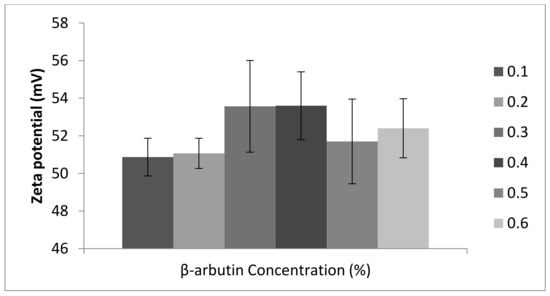 The zeta potential is an important parameter used to characterize the stability of dispersion systems [26]. The zeta potential describes the electrokinetic potential of particles within colloidal systems and is defined as the potential difference between the shear location, corresponding to the surface of a tightly bound surface layer, and bulk solution [27]. As the zeta potential approaches 0 mV, inter-particulate repulsion reduces, and so a dispersion becomes less stable since particles are better able to approach one another to interact and form aggregates, a sign of lower dispersion stability [4,14]. A flocculated dispersion, consisting of loose aggregates, will typically have a zeta potential within the range of −20 to +20 mV. Thus, increasing the zeta potential beyond this will improve overall dispersion stability against aggregation [27]. In summary, greater repulsive forces between particles prevents aggregation and improves dispersion stability [31,32]. The zeta potentials (Figure 3) of the β-arbutin CSNPs remain within acceptable limits, which contribute to overall stability.