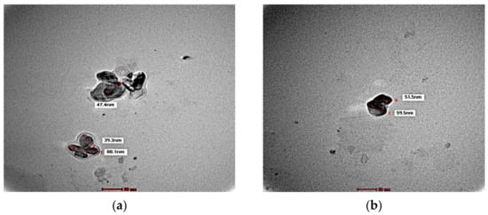 TEM of β-arbutin CSNPs was utilized to assess morphology and uniformity. The resulting TEM monograph of β-arbutin CSNPs (Figure 4) indicates spherically shaped nanoparticles in a near mono-dispersed system with a particle size range of 39.3 to 318 nm. Zetasizer analysis also demonstrated an acceptable range size of 120 nm to 300 nm. Previous published studies report similar spherical, rough-surfaced nanoparticles [20,46,47]. In addition, aggregation behavior is observed in some nanoparticles, and this could be due to interactions at substrate surfaces occurring upon drying or the result of volatilization of solvent on substrate surfaces, leading to interactions [48,49].
