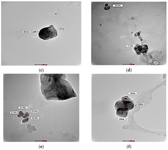 Transmission electron microscopy at 86,000× of 0.1% (a), 0.2% (b), 0.3% (c), 0.4% (d), 0.5% (e), and 0.6% (f) β-arbutin CSNPs.