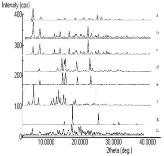 XRD analysis of 0.1% β-arbutin (a), 0.2% β-arbutin (b), 0.3% β-arbutin (c), 0.4% β-arbutin (d), 0.5% β-arbutin (e), 0.6% β-arbutin (f), blank CSNPs (g), and free β-arbutin (h).
