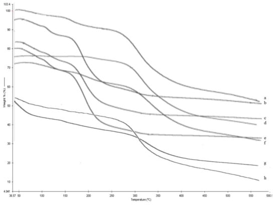 Thermograms of 0.1% β-arbutin (a), 0.2% β-arbutin (b), 0.3% β-arbutin (c), 0.4% β-arbutin (d), 0.5% β-arbutin (e), 0.6% β-arbutin (f), CSNPs, free β-arbutin (g), and blank CSNPs (h).