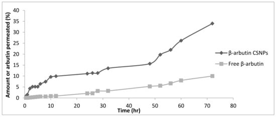 Permeation studies in rat skin were conducted over 72 h using 0.4% β-arbutin CSNPs, previously determined to possess the highest EE and LC. The results for the percentage of drug permeation for both β-arbutin CSNPs and free β-arbutin are shown in Figure 7. Based on the obtained results, the percentage of permeation of β-arbutin CSNPs was significantly higher than its free form. In the first 6 h, the percentage of permeation of β-arbutin CSNPs was around 6.4%, which slowly increased with time. The percentage permeation of free β-arbutin was low, 0.6% for the first 6 h. After 24 h, the percentage permeation of β-arbutin CSNPs was 11.1%, in comparison to the free form which was only 0.9%. After 72 h, β-arbutin CSNPs’ percentage permeation through the skin reached approximately 34% and was significantly higher than the permeation of free β-arbutin (where p < 0.05). β-arbutin permeation comparisons were also performed at 12, 24, and 48 h, and the results indicated a significantly greater permeation of β-arbutin from CSNPs than its free form.