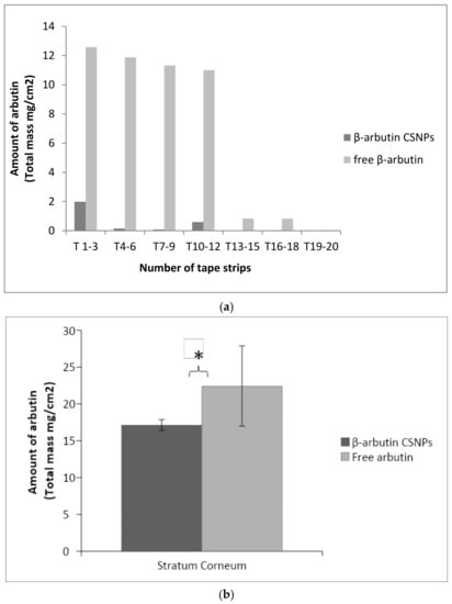 In vitro penetration study of 0.4% β-arbutin CSNPs and free β-arbutin. (a) Amount of arbutin found in the different tape strips and (b) Total amount of arbutin in the stratum corneum. (* indicates a significance difference, p < 0.05).