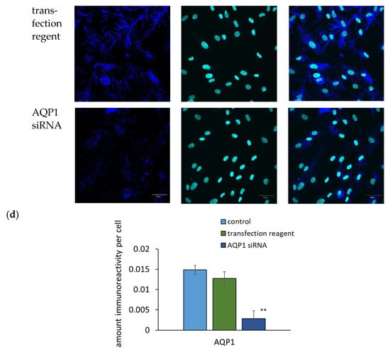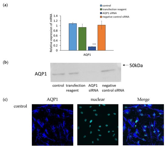Figure 1a,b show the AQP1 mRNA and protein levels in human dermal fibroblasts cultured in untreated medium (control), medium with the transfection reagent, medium with AQP1 siRNA, or medium with the negative control siRNA for 3 days. The human dermal fibroblasts cultured with AQP1 siRNA showed lower amounts of AQP1 mRNA and its protein than those cultured with the control medium, the cells with the transfection reagent, and the cells cultured with the negative control siRNA. The efficiency of AQP1 knockdown was approximately 80% or higher.