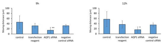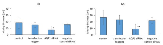 Motility activity of human dermal fibroblasts cultured with the addition of AQP1 siRNA. *: p < 0.05 vs. the transfection reagent. **: p < 0.01 vs. the transfection reagent. The figures show the means ± standard deviations (n = 7).