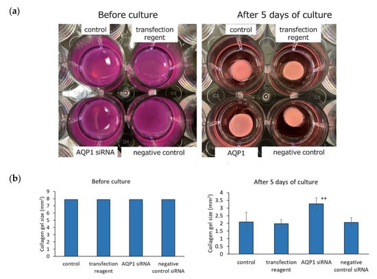Fibroblasts cultured in untreated medium (control), medium with the transfection reagent, or medium with AQP1 siRNA were collected by 0.05% trypsin-EDTA treatment. The collected cell suspension and 10% FBS-DMEM were added at a ratio of 1:1 to a centrifuge tube and centrifuged at 1100 rpm for 5 min, and the cells were collected by decanting. To a 24-well plate on ice, 100 μL of 5 × MEM, 5 μL of 100 × Gluta MAX, 25 μL of FBS, 350 μL of 3 mg/mL of Native collagen (Koken Co., Ltd., Tokyo, Japan), 10 μL of 1 mol/L of NaHCO3, and 20 μL of cultured fibroblasts (2 million cells/mL) were added. The plate was placed in an incubator (37 °C, 5% CO2) for 1 h. The gel attached to the wall of the plate was detached with a syringe needle, and 500 μL of one of the three types of media was added to each well, and the plate was incubated in an incubator (37 °C, 5% CO2) for 5 days. Relative cell counts were obtained using a Cell Counting Kit-8 (Dojindo Chemical Research Institute, Kumamoto, Japan). Cell Counting Kit-8 solution was added and the absorbance of the water-soluble formazan dye after 0 and 2 h was measured at 450 nm using a multi-detection microplate reader (Multi-Detection Microplate POWERSAN HT; BioTek, Winooski, VT, USA). Cell viability was expressed as the difference between the two absorbance values.