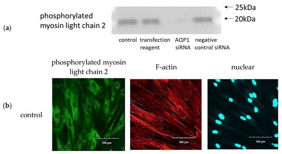 Human dermal fibroblasts were cultured in untreated medium (control), medium with the transfection reagent, or medium with AQP1 siRNA for 3 days. Human dermal fibroblasts cultured with AQP1 siRNA showed lower amounts of both phosphorylated myosin light chain 2 and F-actin than those cultured in the control medium, those cultured in medium with the transfection reagent, or those cultured in the negative control siRNA (Figure 4a). Figure 4b shows the images of cultured human dermal fibroblasts stained with the anti-phosphorylated myosin light chain 2 antibody and phalloidin-iFluor 555 conjugate obtained by confocal laser scanning microscopy. Cultured human skin fibroblasts transfected with AQP1 siRNA showed reduced levels of both phosphorylated myosin light chain 2 and F-actin. Furthermore, the amount of antibody staining per cell was determined using ImageJ, and the levels of both phosphorylated myosin light chain 2 and F-actin were significantly reduced in the cells treated with AQP1 siRNA compared with those cultured in the medium with the transfection reagent (Figure 4c).